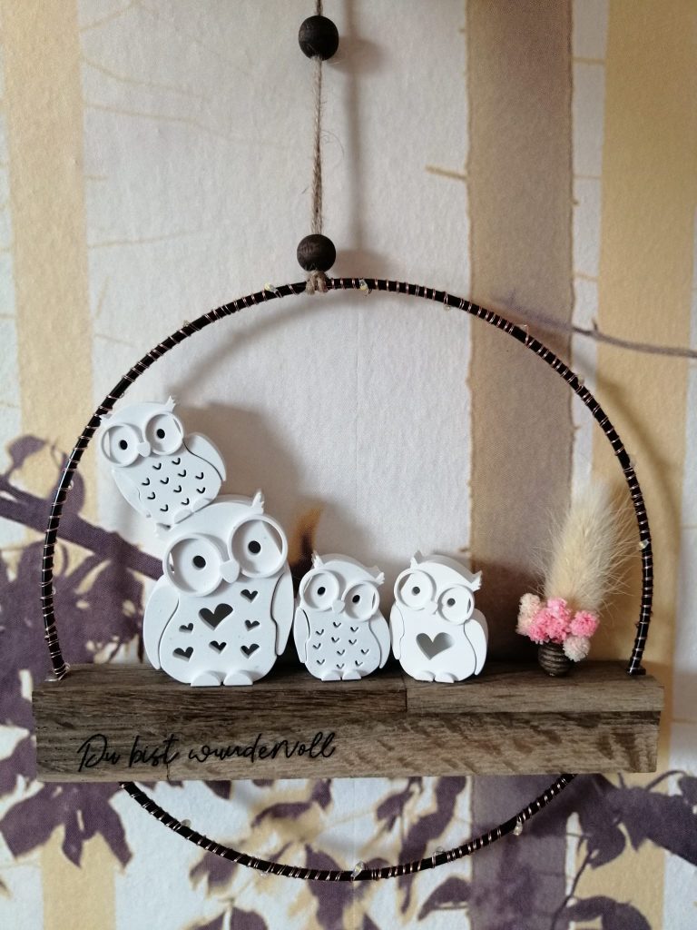 Metallring mit einer Eule 6cm & drei 4cm in verschiedenen Ausführungen der Trockenblumen zum hängen und aufstellen